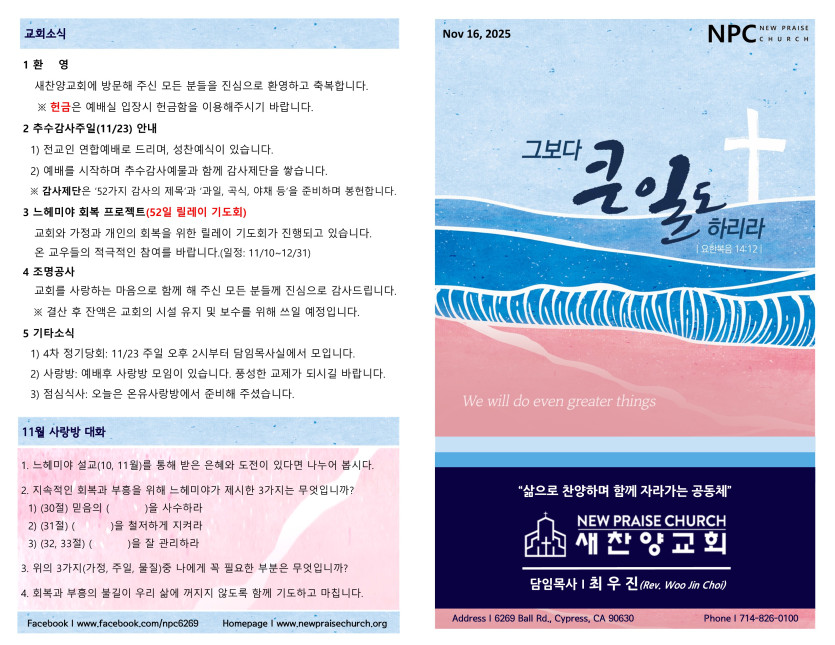 November 15, 2025 . 새찬양교회 [111625] 주일예배 주보