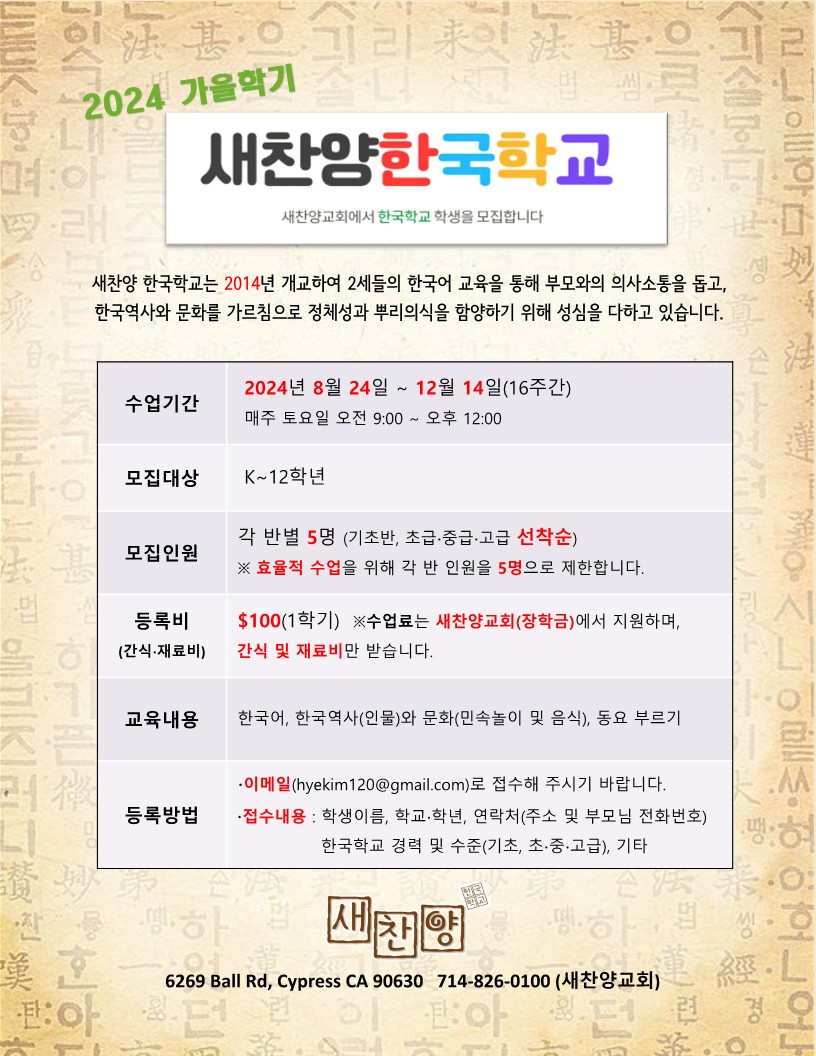 [2024] 새찬양한국학교 개강안내(가을학기)